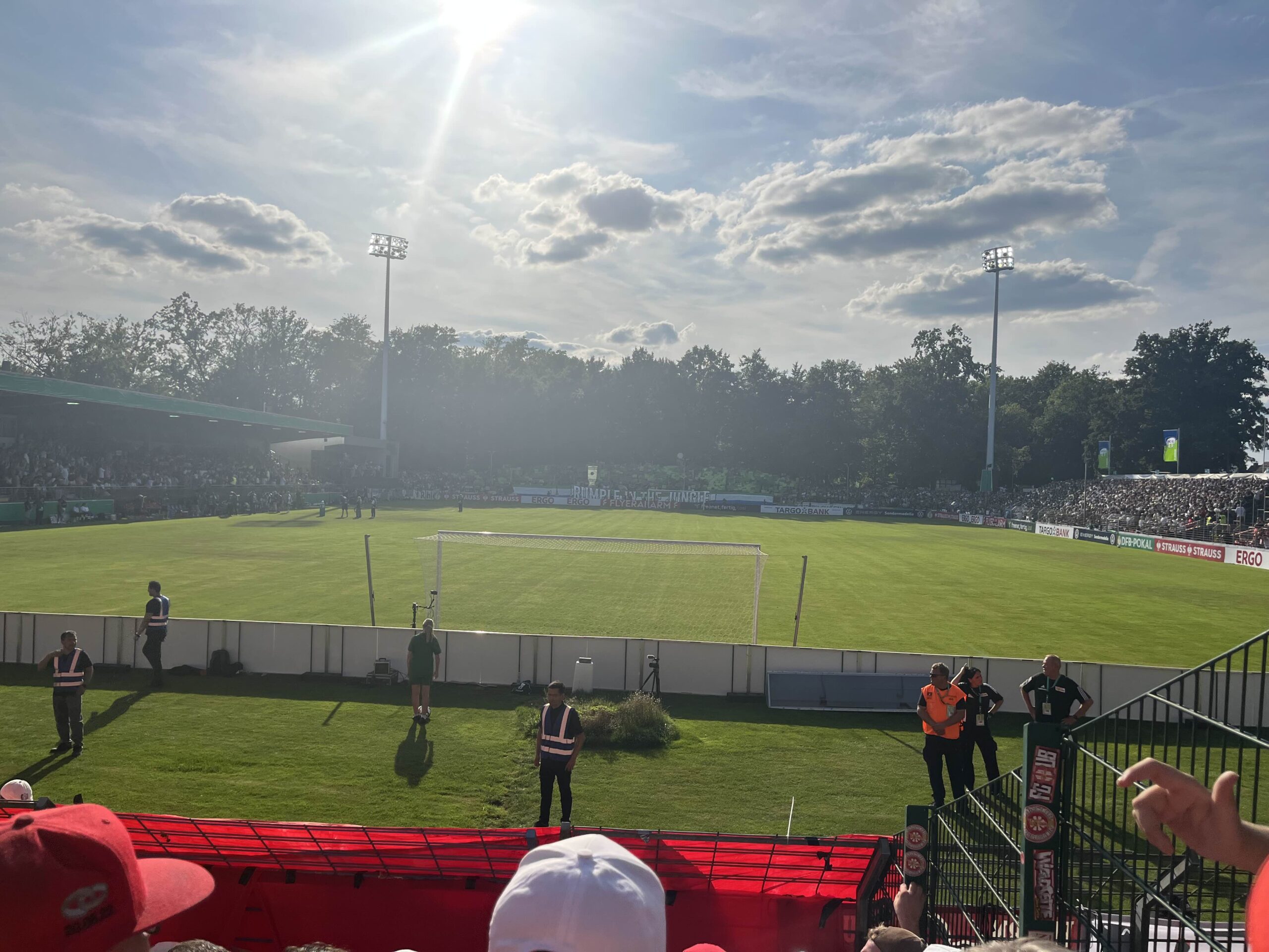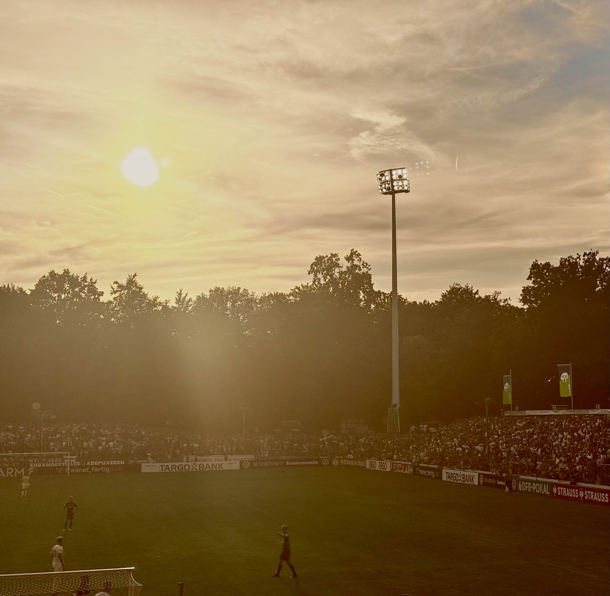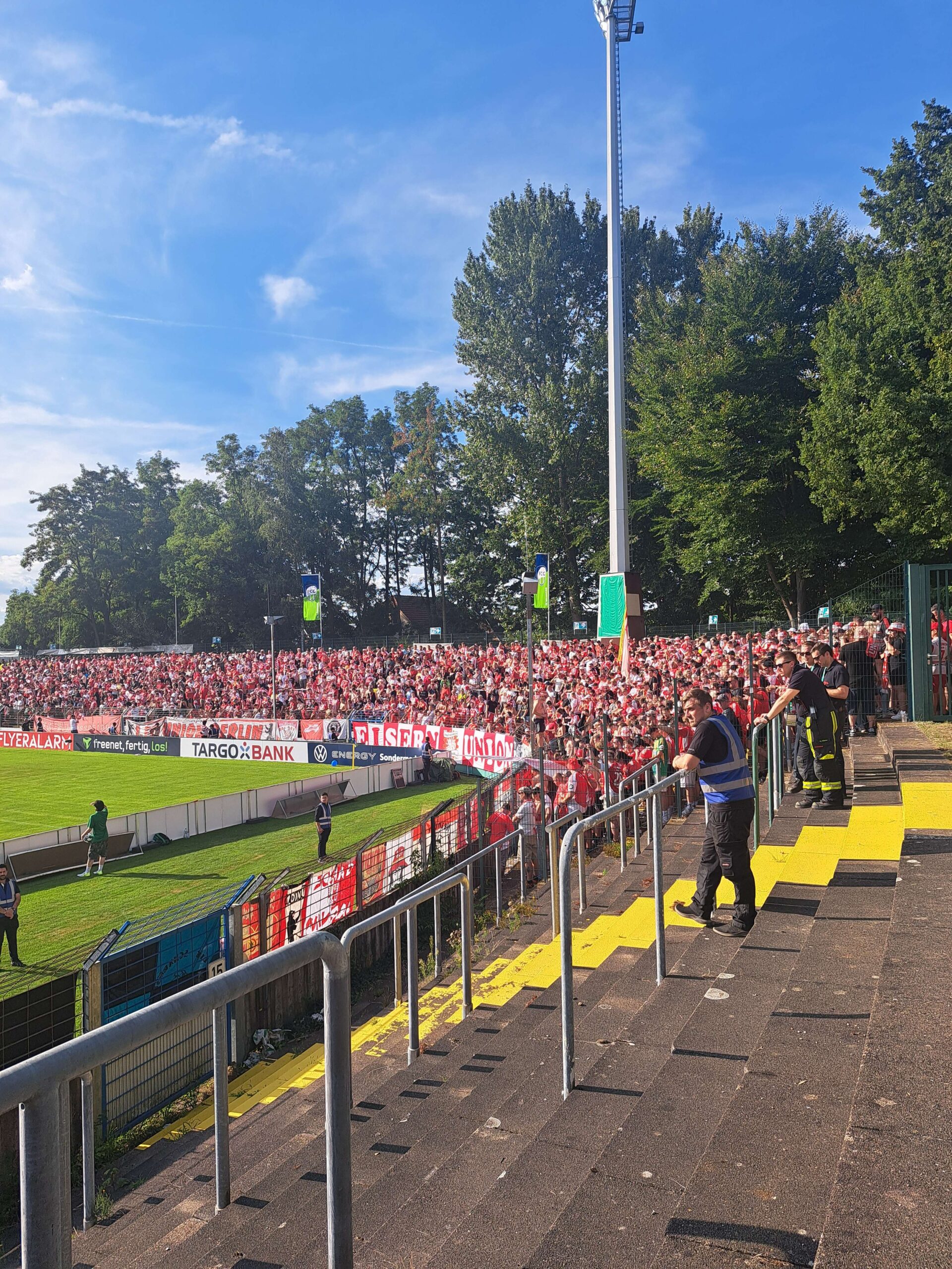 Während der unterklassige Gegner schon Spielpraxis sammeln konnte und hochmotiviert ist, einen Einmal-im-Leben-Moment zu kreieren. Selbst ist man auch noch in der dösigen Schwere des Sommers, überall openair, Musik, Kino, Essen, Bier im Garten mit Zapfhahn. Und alles möglichst ganztägig. In diese Entspannung hinein heißt es wieder auf die Autobahn, weil diese erste Runde traditionell für den Bundesligisten in der Ferne stattfindet. Die Ferne hieß diesmal Gütersloh. So fliegen wir über A2 einigermaßen freudig dem ersten Pflichtspiel der Saison entgegen.