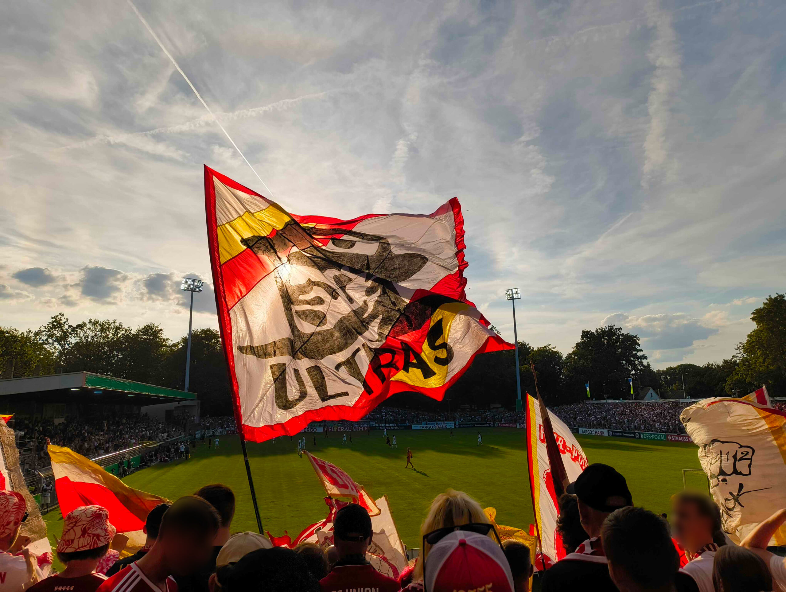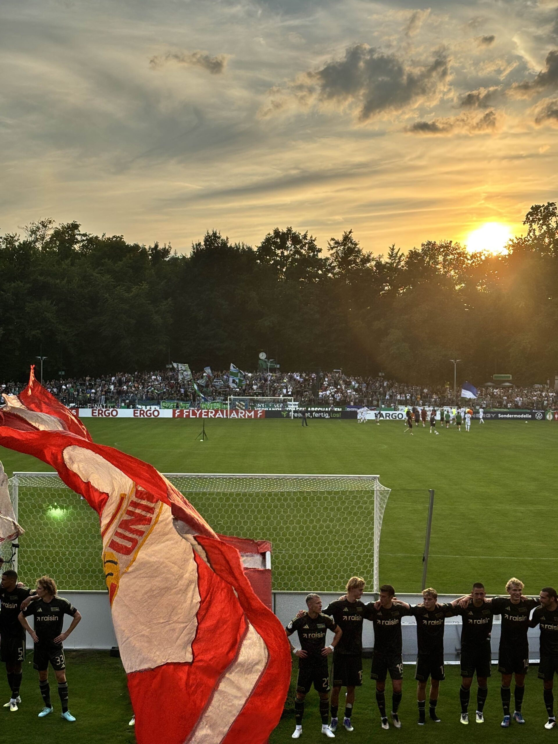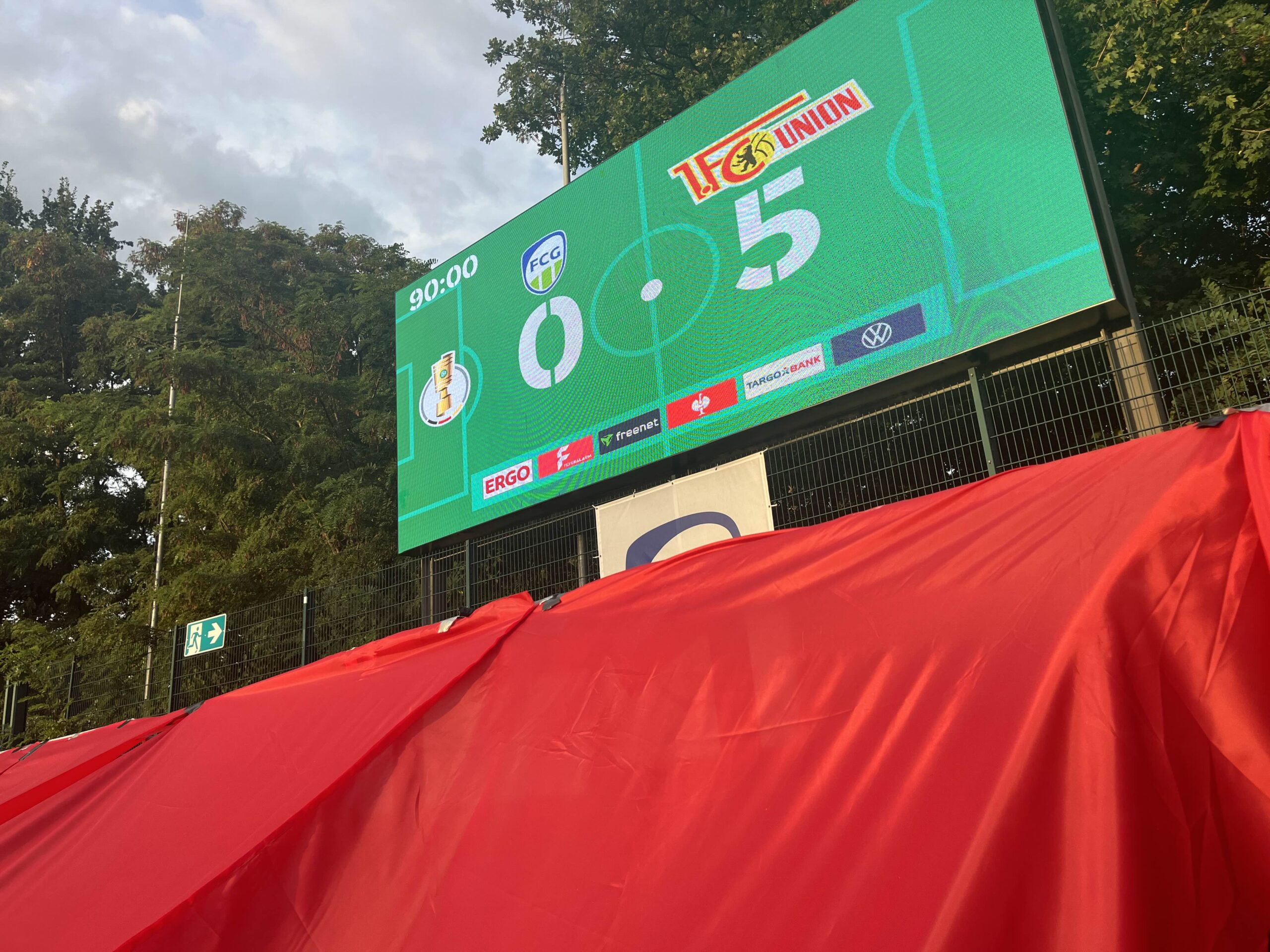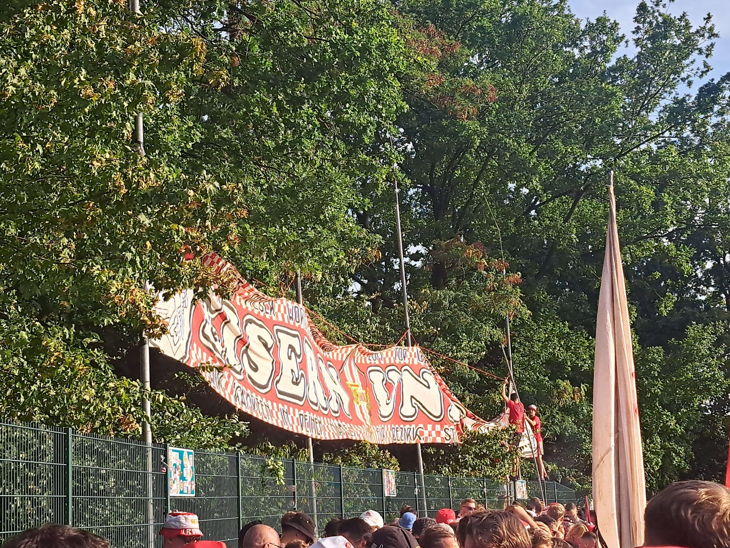 Zu Beginn, wie es sich für einen guten Saisonstart gehört, wird auf beiden Seiten ein wenig choreografiert. Wir probieren einen neuen Chant, der noch in vielem ausbaufähig ist. Angemessene fünf Tore später ist diese Pflichtaufgabe erfüllt und Union eine Runde weiter. Das Ergebnis ist hoch, aber nicht demütigend hoch. Der sicher verdiente Ehrentreffer blieb dem FCG versagt. Aus unserer Sicht ist das natürlich positiv, weil es uns gelungen ist, kein Gegentor zu bekommen.
