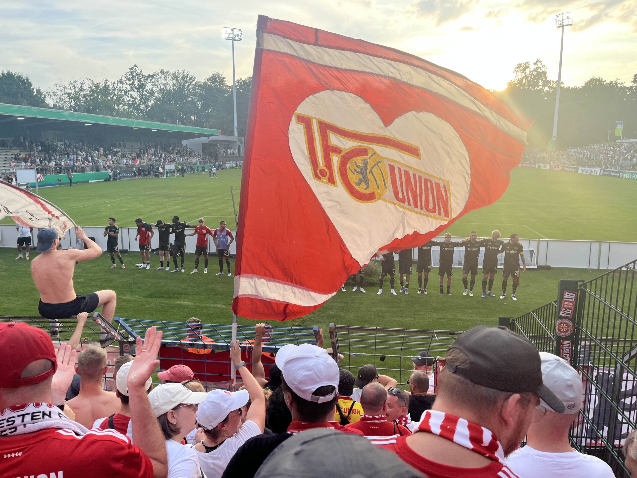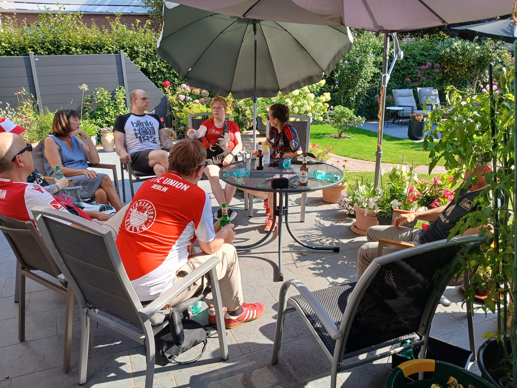 Wir haben gelernt, dass Matheo Raab ein solider Ersatz für Freddie sein kann. Auch wenn ich persönlich Unions Einkaufspolitik bei Torhütern nicht richtig nachvollziehen kann, verstehe ich, warum es Matheo geworden ist. Nach dem Bedanken bei der Mannschaft für das Spiel, das ein wenig Sorgen nimmt, gehen wir zurück zu P. und M., die uns mit Glückwünschen und Getränken erwarten. In der lauen Kühle des Sommerabends sitzen wir auf der Terrasse. Die schnelle Abfahrt nach Berlin verschieben wir auf später. Nachbarn winken, ebenfalls gratulierend, über den Gartenzaun.