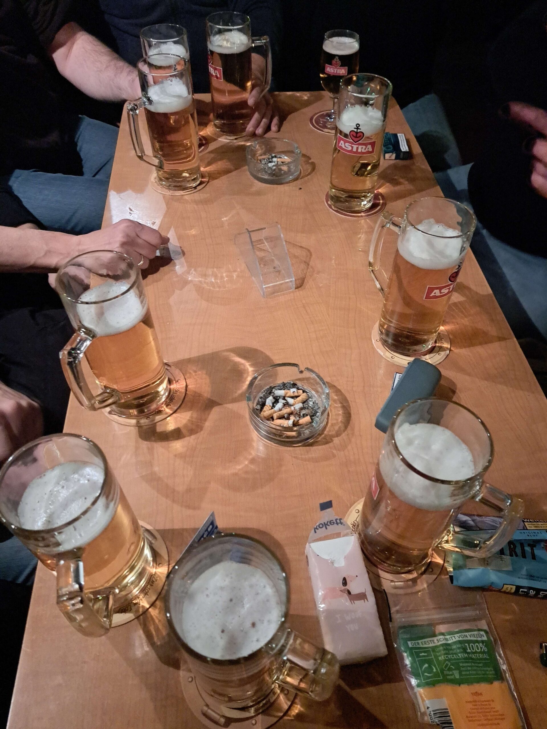 In der gar nicht mal so viel Platz bietenden Lokalität wird bei unserer Ankunft gerade ein Tisch frei, den wir sogleich belegen. An zwei Tischen ist eine Geburtstagsparty wohl schon seit etwas längerem im Gange und bestimmt den Klang des weiteren Abends – laut, lebensfroh und sangesfreudig angetrunken, angetrieben von der Jukebox, die trotz ihrer Jahre eines der neueren Stücke im Inventar ist. Dem Kiez angemessen bestellen wir Astra in allen Spielarten, groß, klein und als Radler. Schanghaien neue Mitglieder mit einer Runde Berliner Luft, die nicht die einzige bleiben wird.