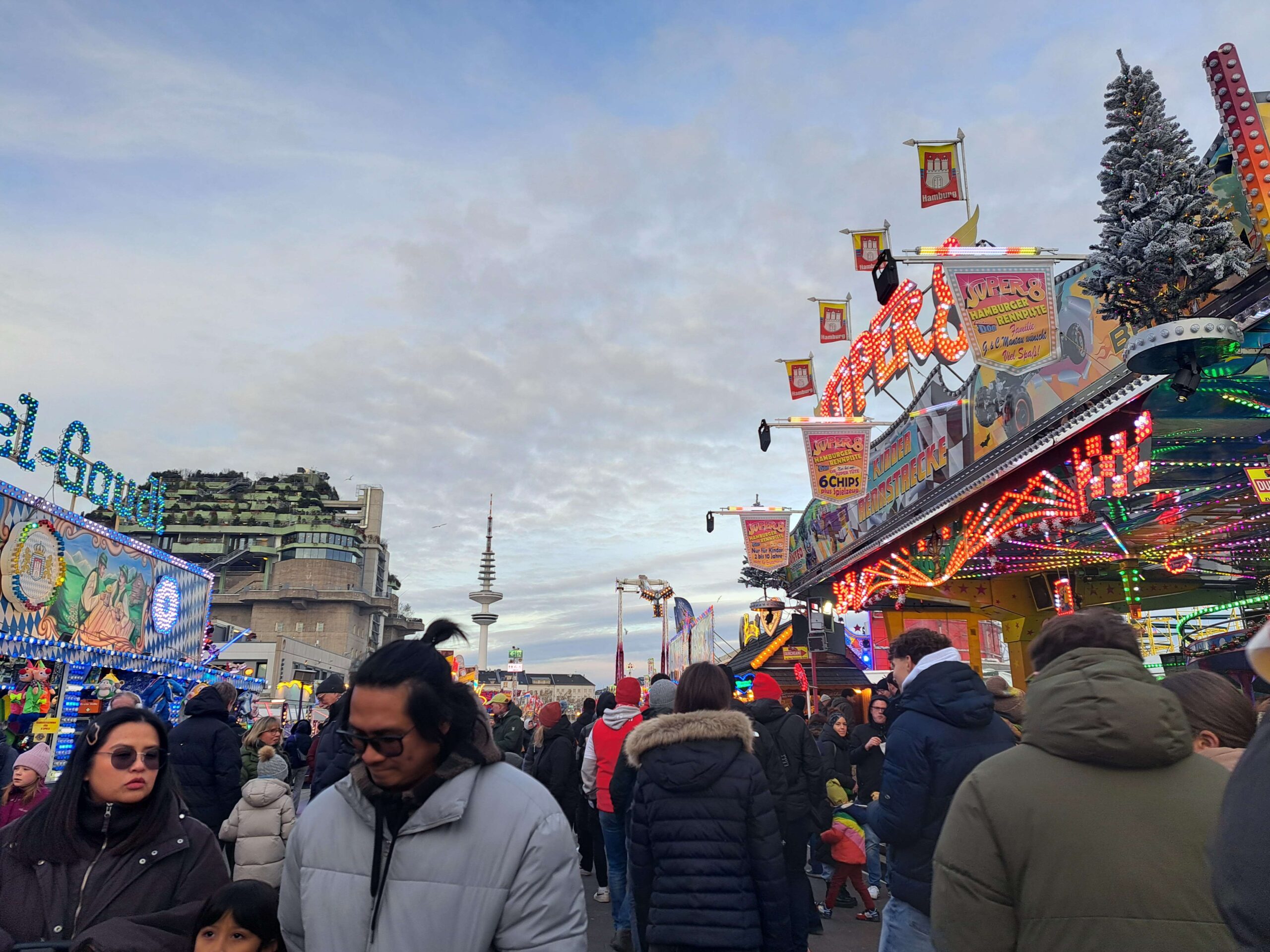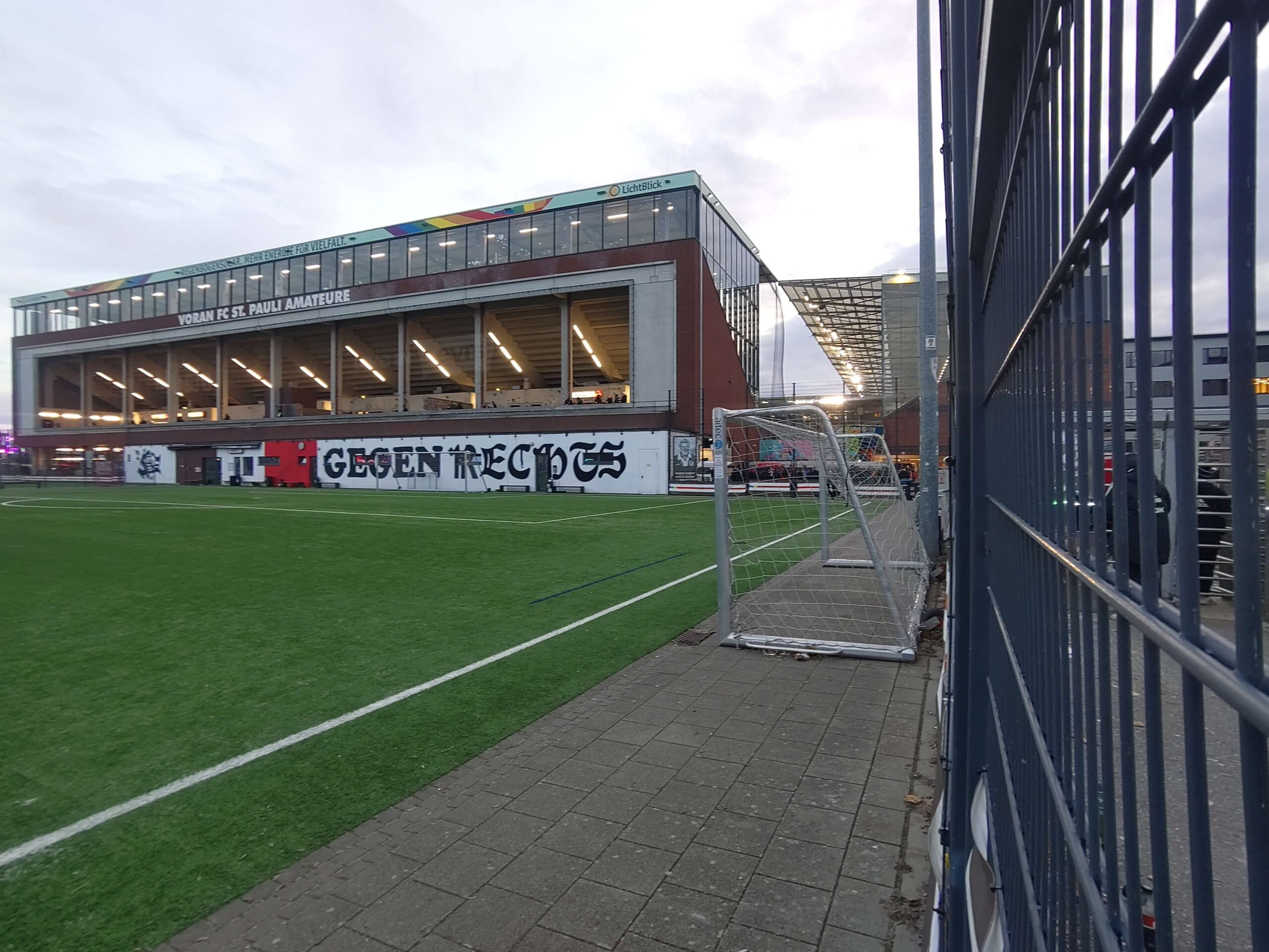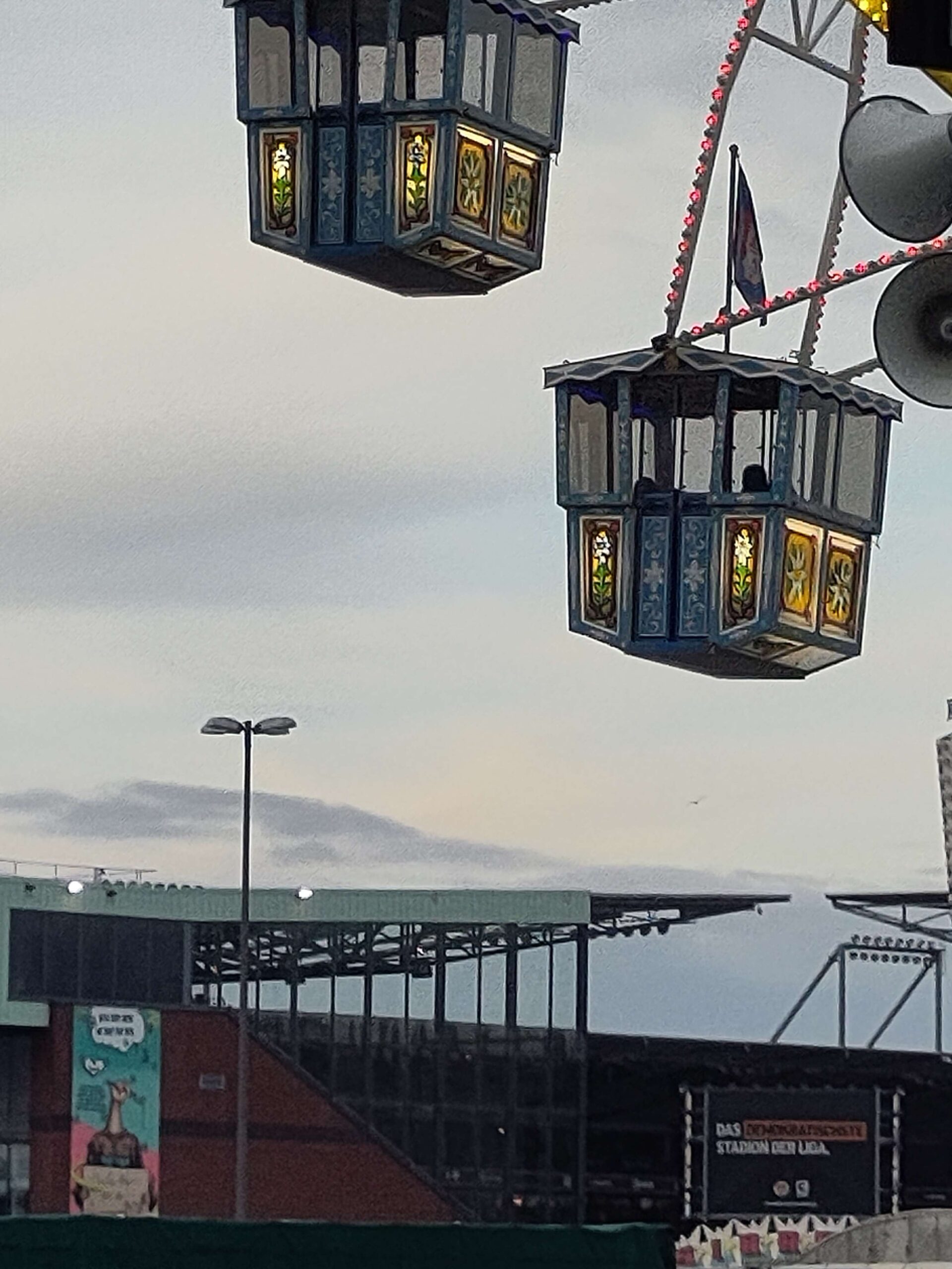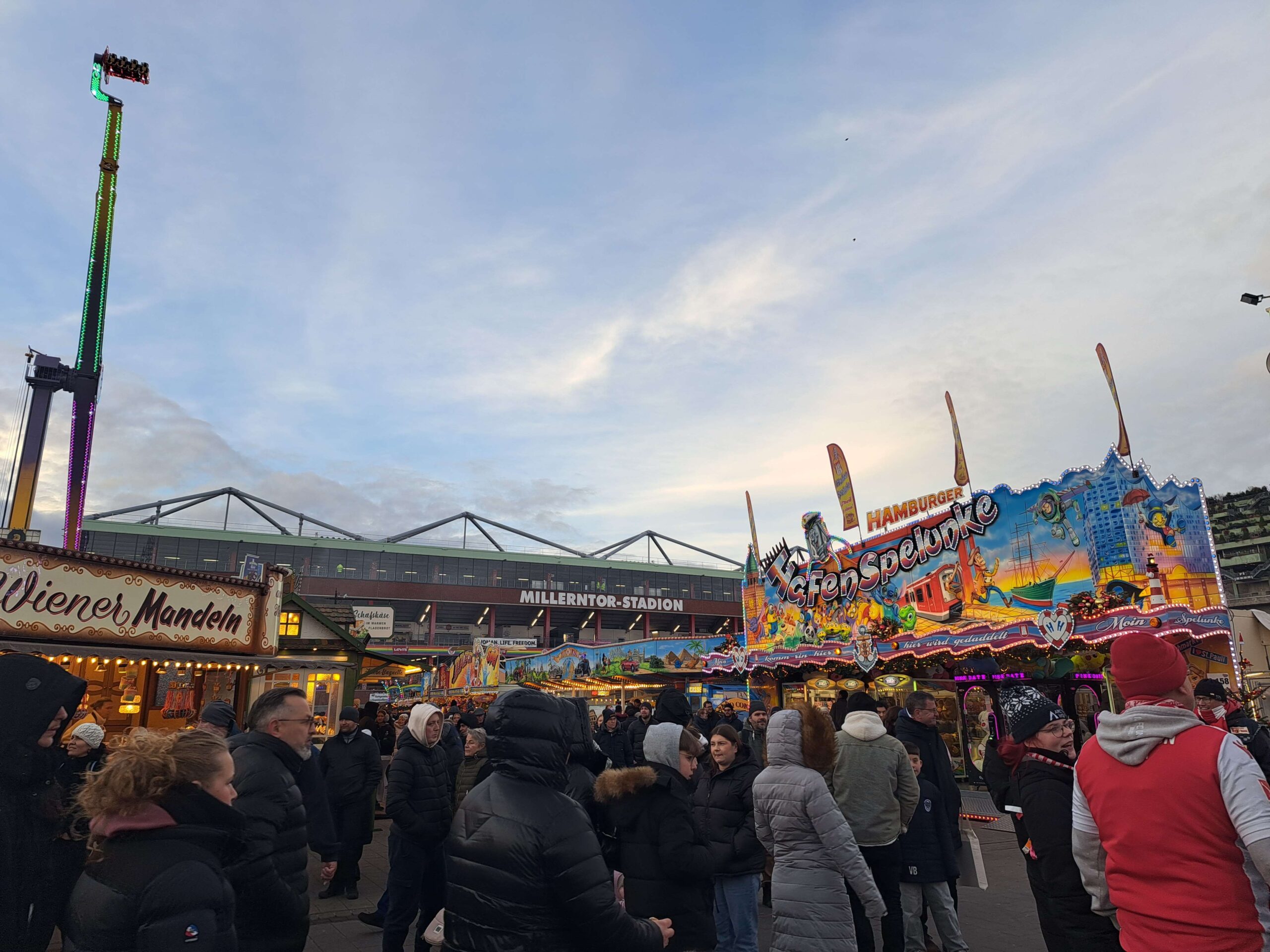 Die Bahn straft unser Misstrauen Lügen und kommt beinahe verzögerungsfrei in der Stadt am nördlichen Ende der Elbe an. Das gibt uns Gelegenheit, als Teil der Übernachtenden in unsere Hotels einzuchecken und die überschüssige Zeit bis zum Spielbeginn der “Wilden Maus” unsere Aufwartung zu machen. Praktischerweise ist das Millerntor direkt neben dem Dom genannten Rummel gebaut worden. So können wir in einer fließenden Bewegung die Idee von “Rutschen für Europa” auf ein ganz neues Niveau heben und nahezu übergangslos zum Einlass am Stadion gelangen.