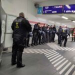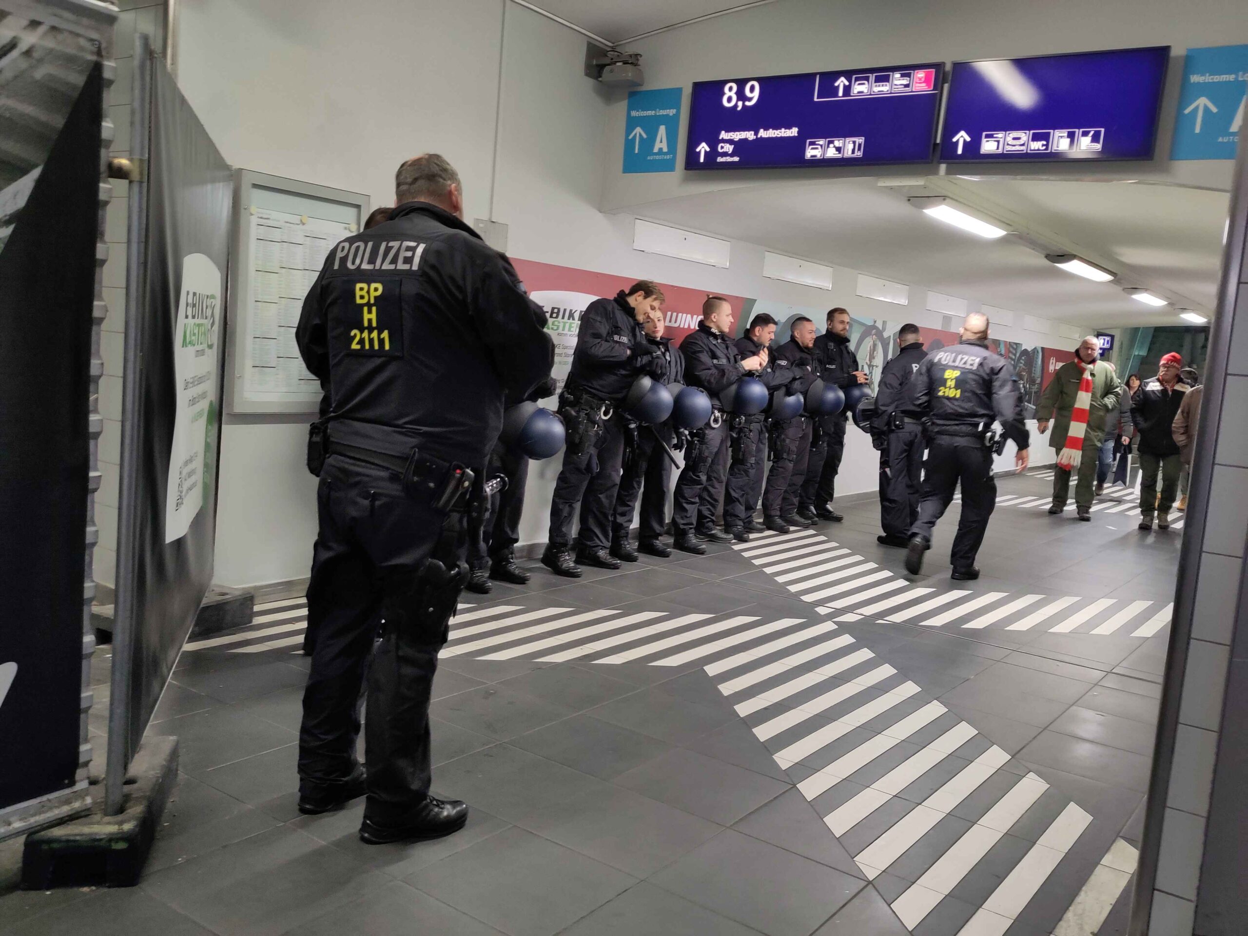 Spaß beiseite die auf den Spuren von Gustav Noske wandelnde Innenministerin Frau Behrens ließ ordentlich Mannstärke (Frauen sind da mit drin) auffahren um eine öffentliche Ordnung zu verteidigen, die offensichtlich von rund dreitausend Unionern so gefährdet war, dass auch Reiter- und Hundestaffel auch mal wieder ins Freie durften. So kamen wir aus der schon gut beschützten Bahnhofskatakombe und traten in ein Viereck, gebildet aus Mannschaftswagen und den dazugehörigen Mannschaften. Es erinnerte ein wenig an die “Gladiator”-Szene als Commodus zu Maximus in die Arena kam.