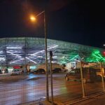 Der Anpfiff drängt zur Eile, wo wir für die Konjunktur noch hätten verweilen können. Mit einem geschickten Anfahrtsmanagement unter Verwendung der Dienste eines Fahrtenvermittlers umgehen wir nicht nur das Gedränge in der Straßenbahn, sondern auch den anderthalb Kilometer langen Fußmarsch zum Stadion, welches in der Dunkelheit ganz pittoresk wie eine Ansammlung fluoreszierender Mikado-Stäbchen aussieht. Auch diesmal wird uns Vernünftigen der Grund dafür verschlossen bleiben, weshalb die von den Augsburger Verkehrsbetrieben bereitgestellten Shuttle-Bahnen ihren Betrieb erst, natürlich ganz harmonisch abgestimmt, mit der Stadionöffnung aufnehmen.