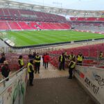Der Einlass ist auch hier in Stuttgart locker und besucherorientiert. Staatliche Ordnungskräfte kümmern sich hauptsächlich um den ordnungsgemäßen Lauf des Straßenverkehrs. Zumindest wenn man nicht erkennbar der aktiven Ultraszene angehört, dann wird man wohl betreut von den Boys* in Blue zum Stadion gebracht. Das führt regelmäßig zu einem verspäteten Ankommen im Block.