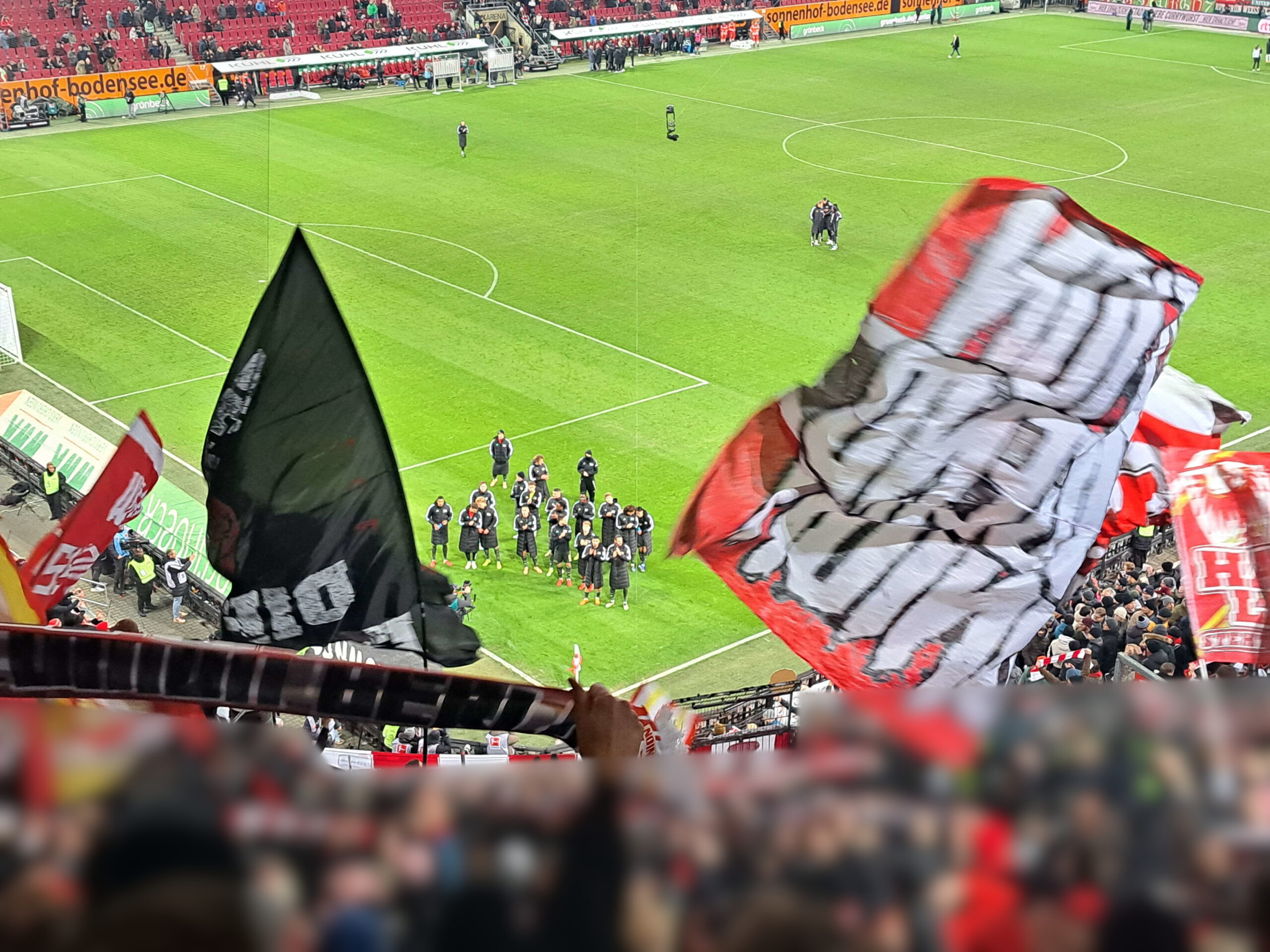 Weil die Mannschaft ihre defensive Stabilität wiedergefunden hat, sind wir mittlerweile sicher, dass es richtige Klatschen nicht geben wird, ganz besonders bei den kriselnden Augsburgern nicht. Am Ende stehen ein Unentschieden, dass für uns gefühlt glücklich war, obwohl es real erarbeitet wurde, eine erste, ganz wunderbare Choreo zum Jubiläum und ein neuer Chant, den wir leider nicht so lange mitsingen können, wie wir es gern getan hätten. Aber die Rückfahrt drängt.