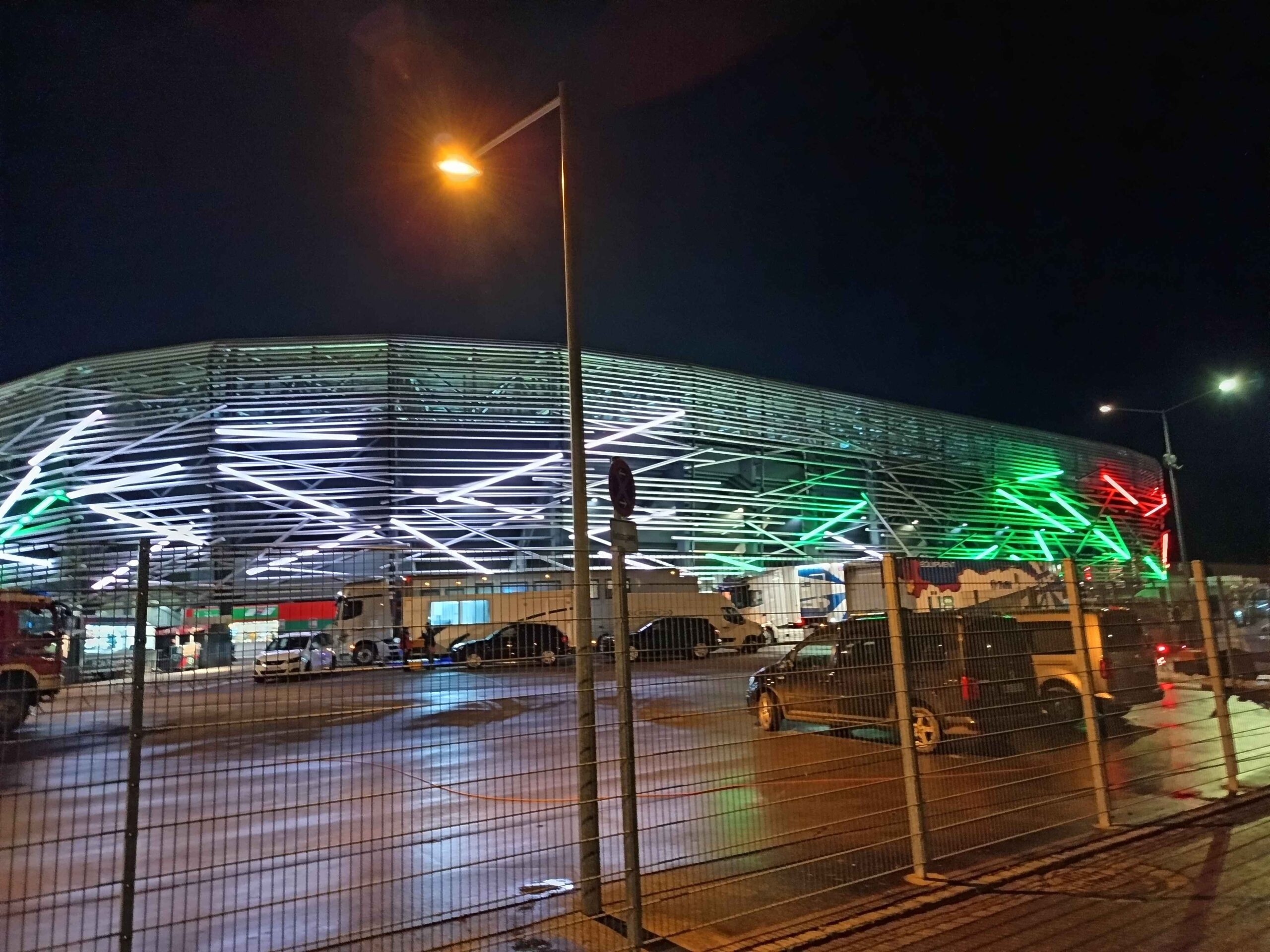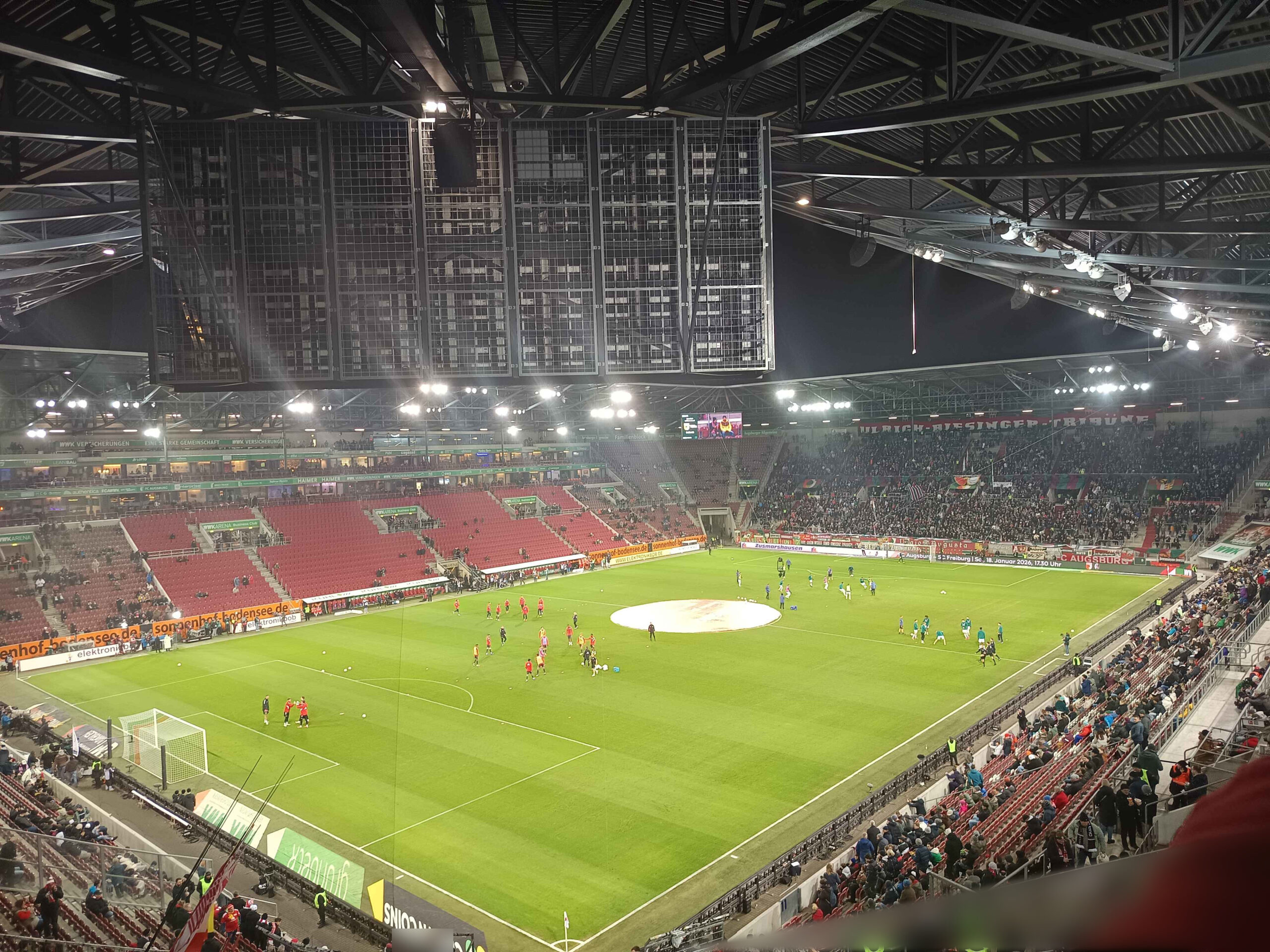 Der Anpfiff drängt zur Eile, wo wir für die Konjunktur noch hätten verweilen können. Mit einem geschickten Anfahrtsmanagement unter Verwendung der Dienste eines Fahrtenvermittlers umgehen wir nicht nur das Gedränge in der Straßenbahn, sondern auch den anderthalb Kilometer langen Fußmarsch zum Stadion, welches in der Dunkelheit ganz pittoresk wie eine Ansammlung fluoreszierender Mikado-Stäbchen aussieht. Auch diesmal wird uns Vernünftigen der Grund dafür verschlossen bleiben, weshalb die von den Augsburger Verkehrsbetrieben bereitgestellten Shuttle-Bahnen ihren Betrieb erst, natürlich ganz harmonisch abgestimmt, mit der Stadionöffnung aufnehmen.