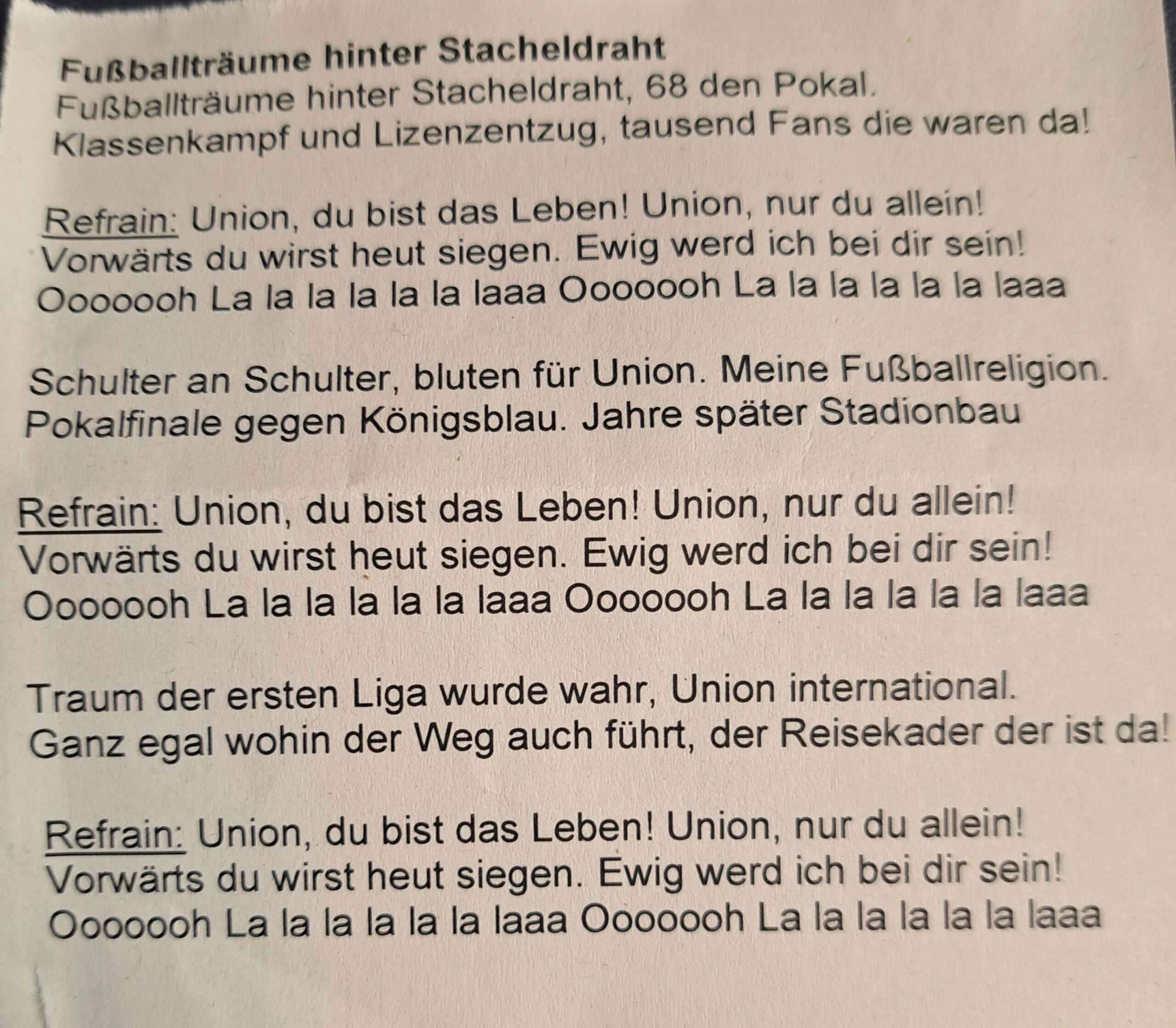 So hielten wir “Schals”, auf denen “kaltschnäuzig” in alternierenden Farbvarianten stand, hoch. Und Banner stellten den Bezug zu heute und dem 1. FC Union Berlin her, indem sie feststellten, dass wir es geblieben sind. Mit einem kaltschnäuzig erspielten Unentschieden, von dem nicht wenige sagten, dass mehr drin war, gehen wir in Vorfreude auf die nächsten Tage aus dem Stadion zum Bahnhof Bad Cannstatt. Unsere Außenstelle Mannheim zieht es nach einem prüfenden Blick auf die Ticket Preise doch lieber mit dem Regio zu fahren und so trennen sich unsere Wege in der Klett-Passage (!).